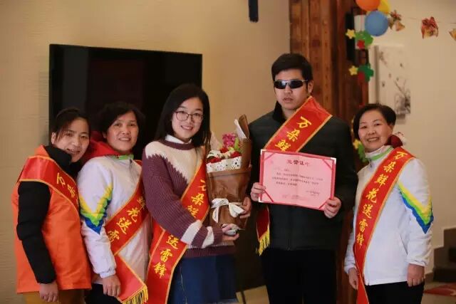 浙江省委宣传部吕铁鹰处长、浙江之声主播贾如和浙江卫视主播子文向成良微公益主题面馆老板张成良送上鲜花。自面馆成立以来,长期资助浙江衢州、丽水两地的贫困中小学生共175人,面馆连续三年、每年冬天免费请杭州环卫工人吃鸡蛋肉丝面共计送出面条约40000多碗。